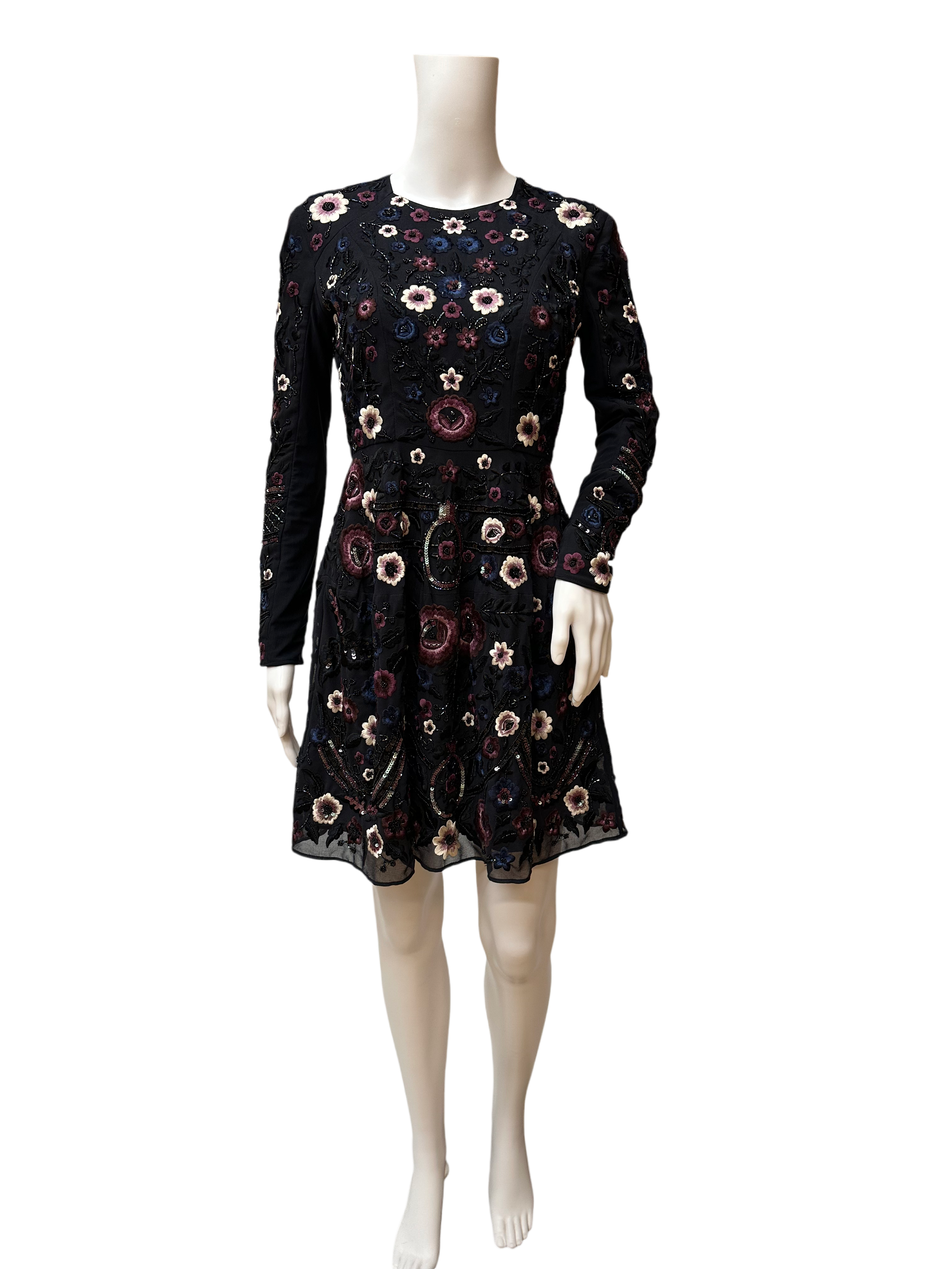 Needle & Thread purple, white, navy and black embroidered flowers with black beading. A line with zipper closure in back. Fully lined. Excellent condition.