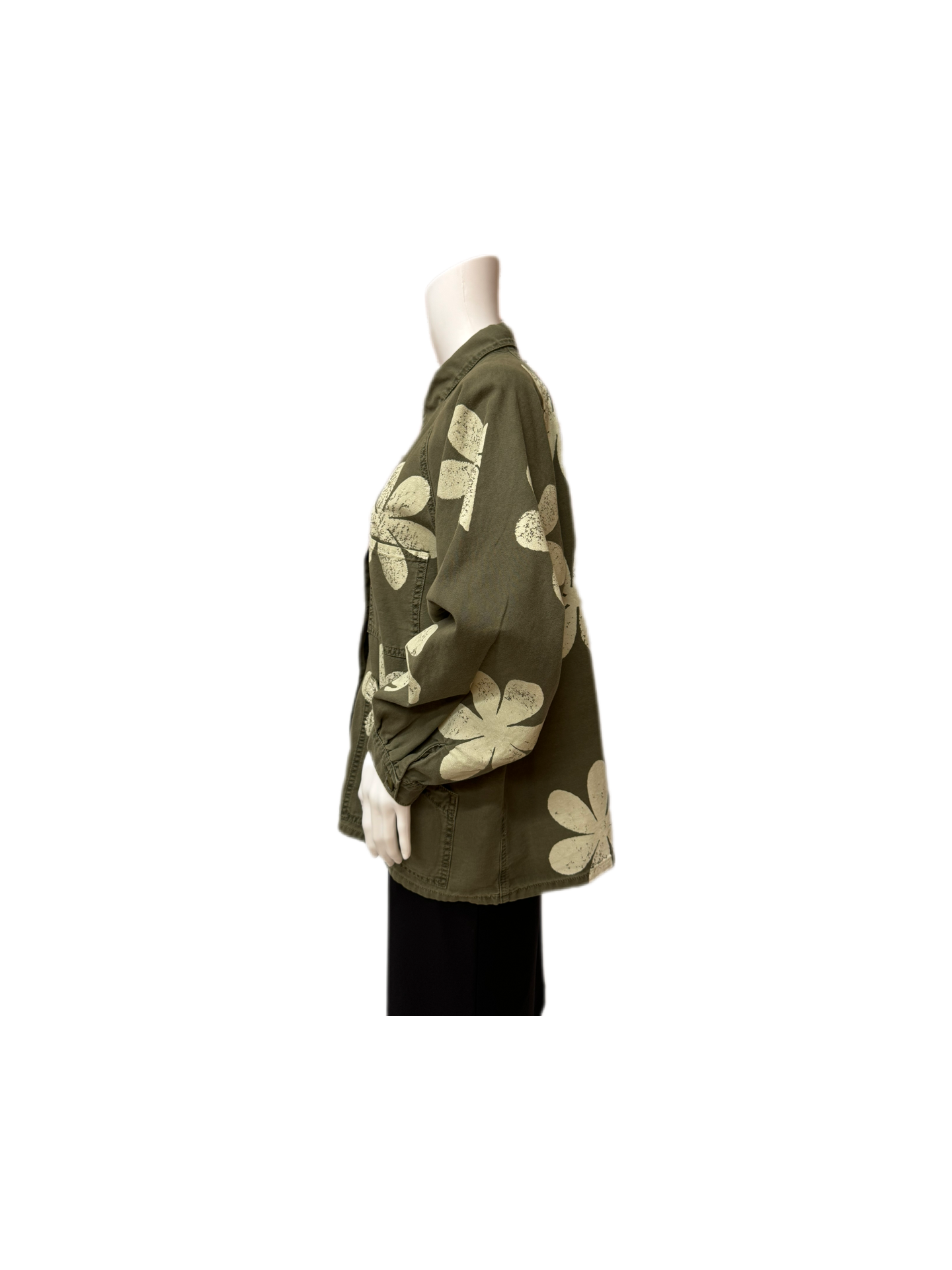 The Great olive green cargo jacket with white large painted flowers. One patch pocket and two angled pockets. Button front closure. Retailed for 425.00. Excellent condition.